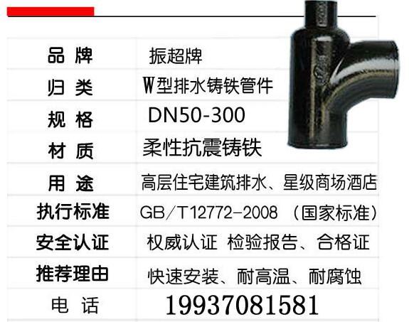 W型鑄鐵排水管件,柔性抗震鑄鐵,快速安裝,耐高溫,耐腐蝕;用于高層住宅建筑排水、星際商場(chǎng)酒店。