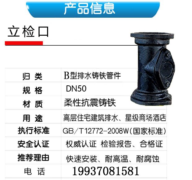 柔性鑄鐵排水管立檢口,柔性抗震鑄鐵,快速安裝,耐高溫,耐腐蝕;用于高層住宅建筑排水、星際商場(chǎng)酒店。