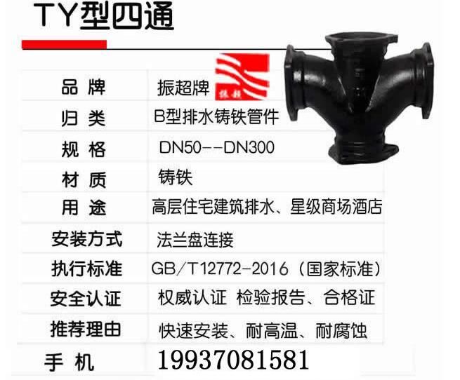 B型TY四通鑄鐵排水管件