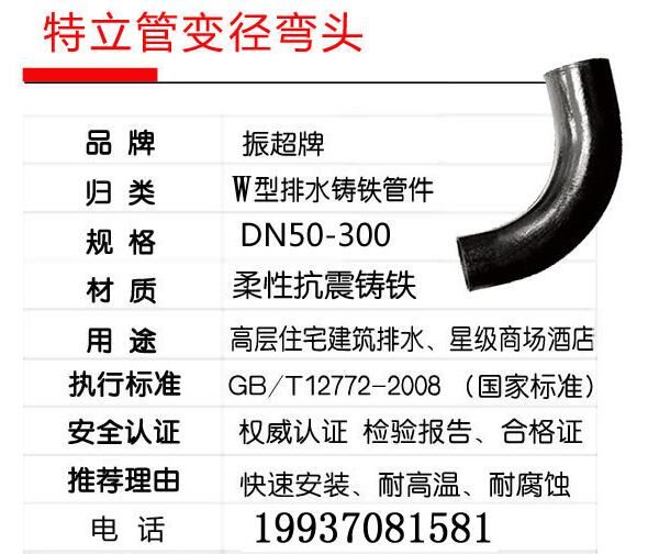 W型離心機(jī)制柔性抗震鑄鐵排水管件,柔性抗震鑄鐵,快速安裝,耐高溫,耐腐蝕;用于高層住宅建筑排水、星際商場(chǎng)酒店。