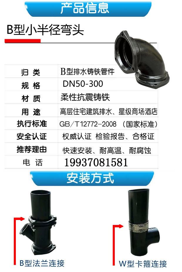 離心機制抗震柔性鑄鐵排水管件,B型小半徑彎頭,柔性抗震鑄鐵,快速安裝,耐高溫,耐腐蝕;用于高層住宅建筑排水、星際商場酒店。