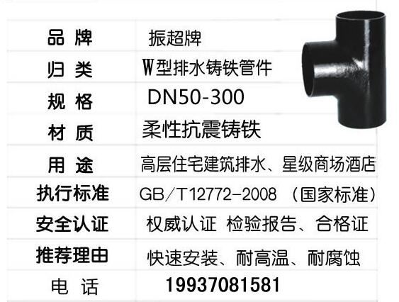 振超牌W型鑄鐵排水管件,柔性抗震鑄鐵,快速安裝,耐高溫,耐腐蝕;用于高層住宅建筑排水、星際商場酒店。