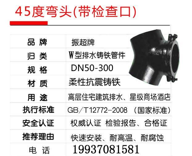 柔性抗震鑄鐵排水管件45度帶口彎頭