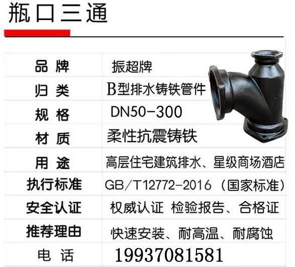 B型柔性抗震鑄鐵排水管瓶口三通